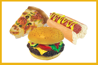 • Assortment consists of REALISTIC vinyl Hot Dog, Burger and Pizza with squeaker inside