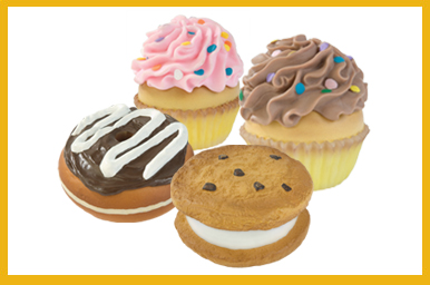 • Assortment consists of REALISTIC vinyl Cupcake, Donut and Ice Cream Sandwich with squeaker inside